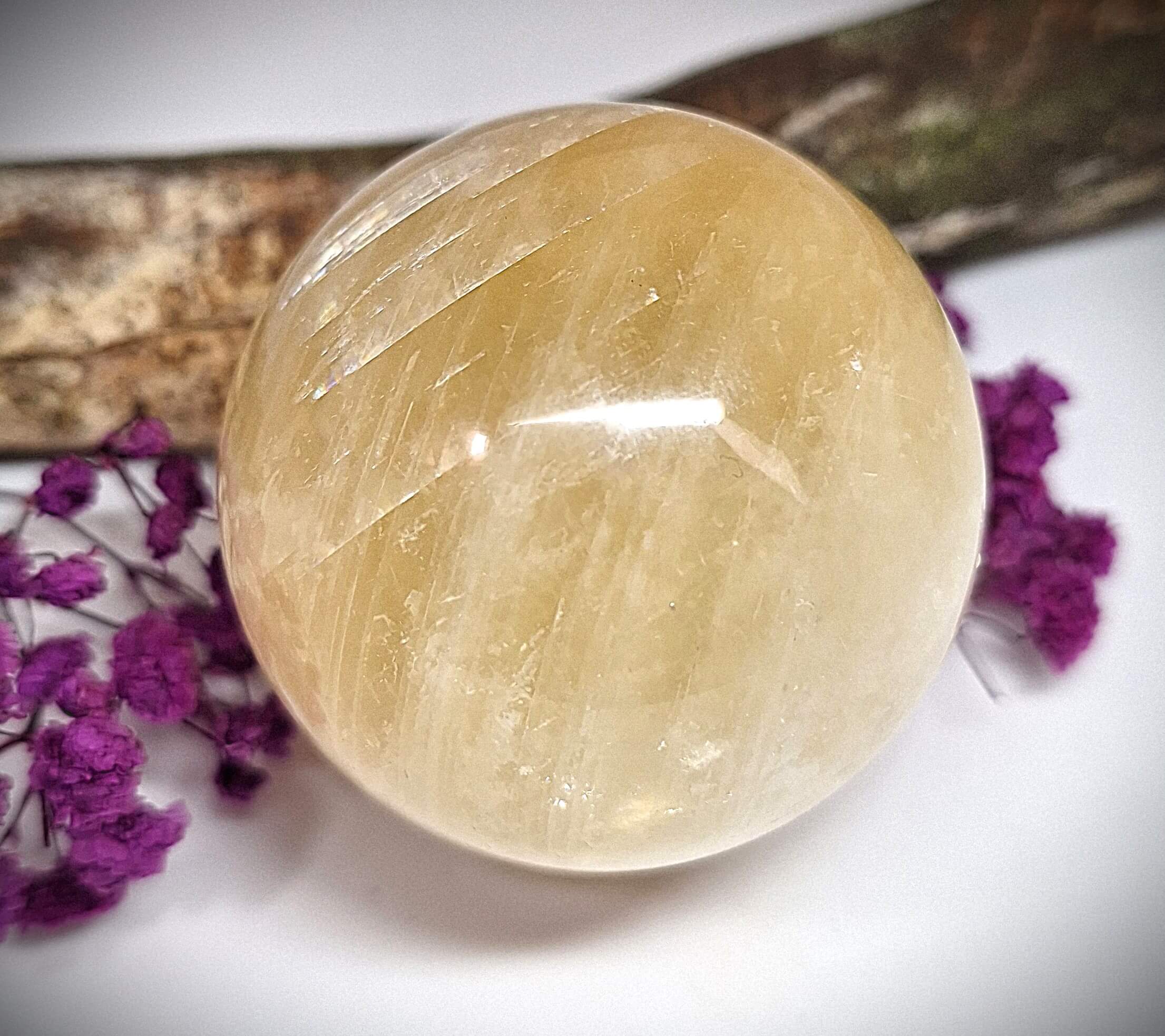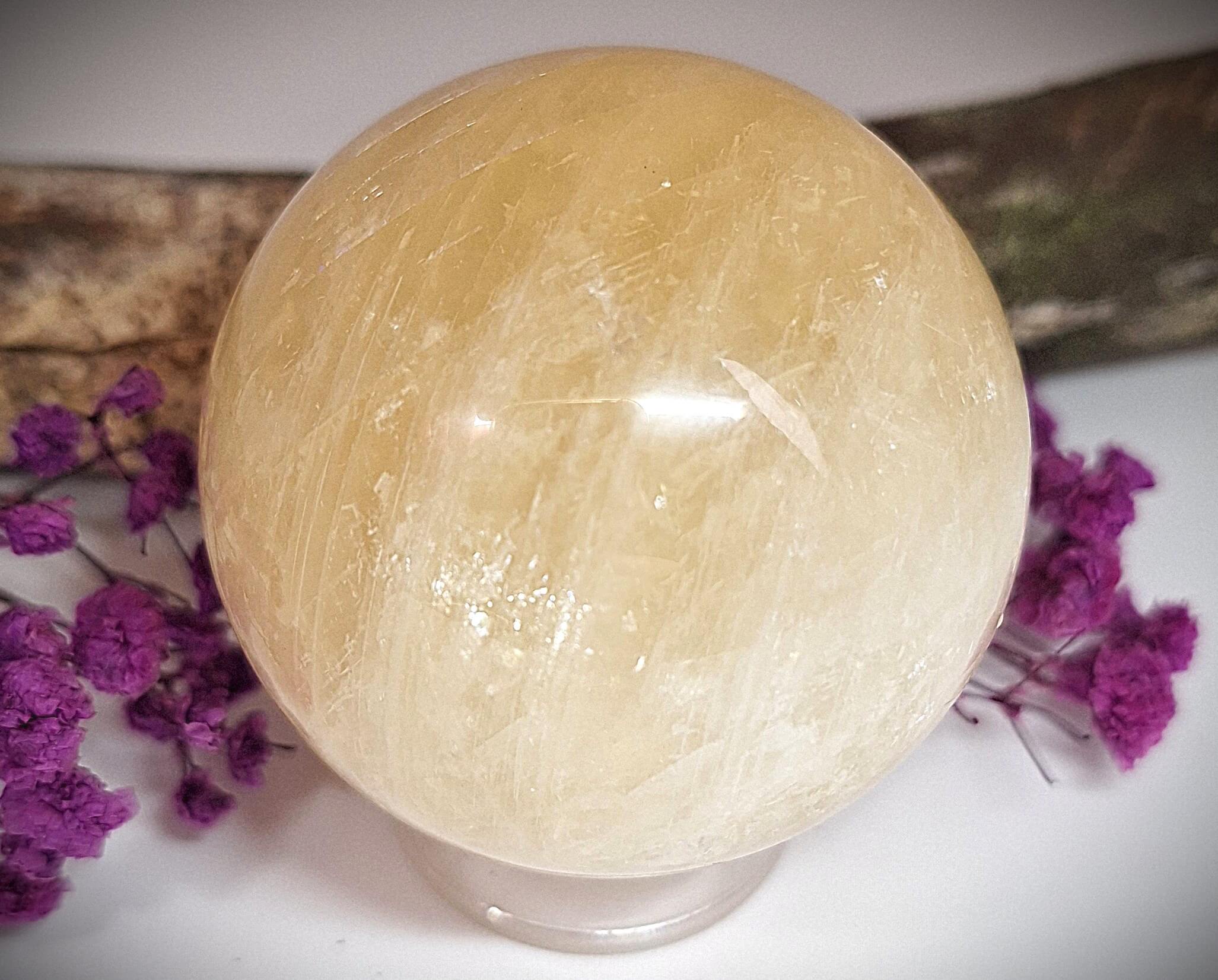 Beim Betrachten dieser Kugel entsteht schnell das Gefühl von Wärme, Licht und innerer Ruhe – genau das, was Honig-Kalzit so besonders macht.