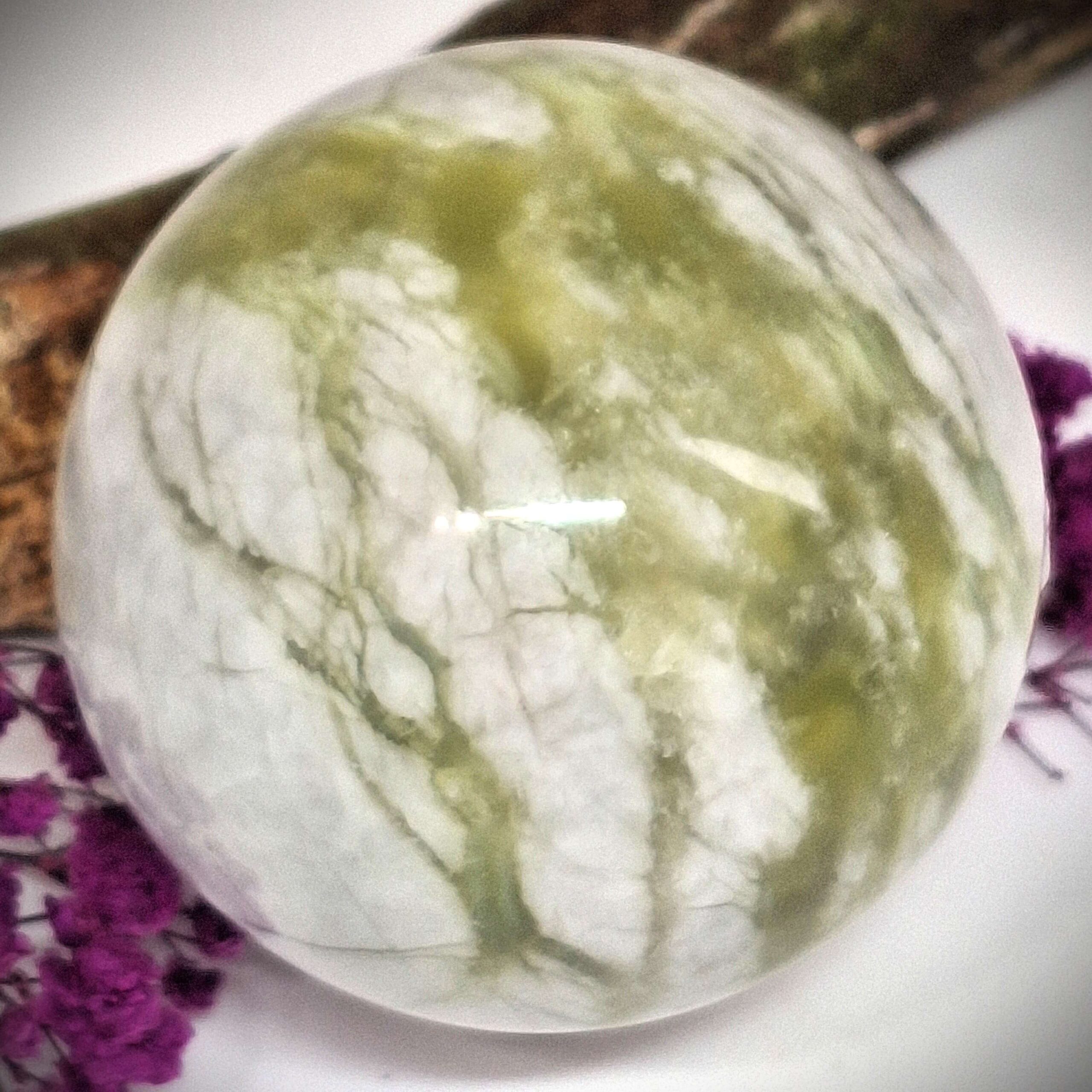 Diese beeindruckende Kugel aus Jade-Serpentin zeigt eine wunderschöne natürliche Zeichnung aus cremigem Weiß und sanften Grüntönen. Die polierte Oberfläche bringt die einzigartigen Adern und Strukturen besonders gut zur Geltung.