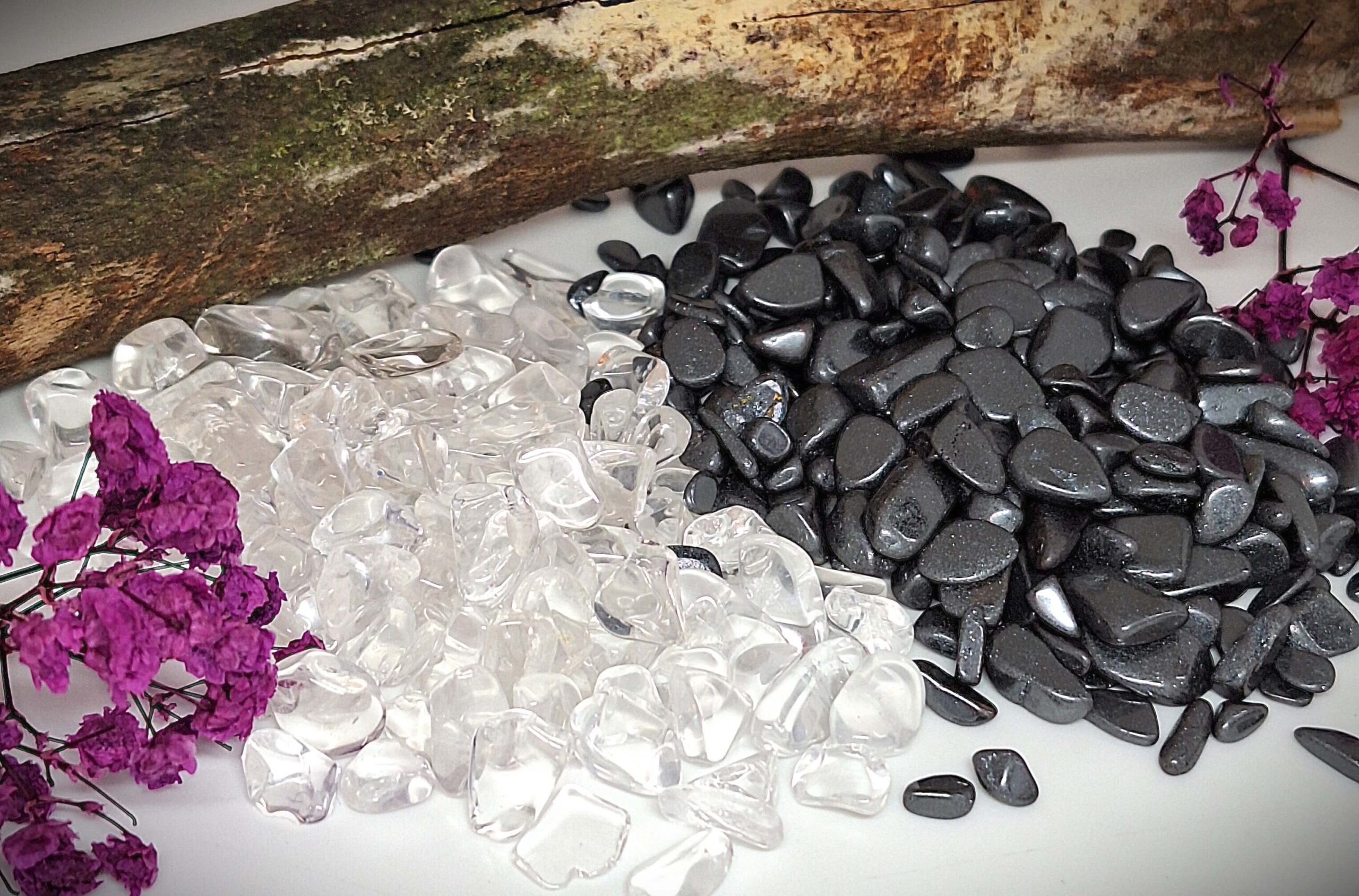 Du erhältst hier ein sorgfältig zusammengestelltes Set aus ca.100 g Bergkristall-Splittern und ca .100 g Hämatit-Splittern. Der klare Bergkristall wird traditionell mit Frische, Klarheit und neuer Energie verbunden, während Hämatit für Erdung, Ausgleich und das Entladen schwerer Energien geschätzt wird. Zusammen ergibt sich eine schöne Kombination für alle, die ihre Trommelsteine, Schmuckstücke oder kleinen Mineralien bewusst pflegen möchten.