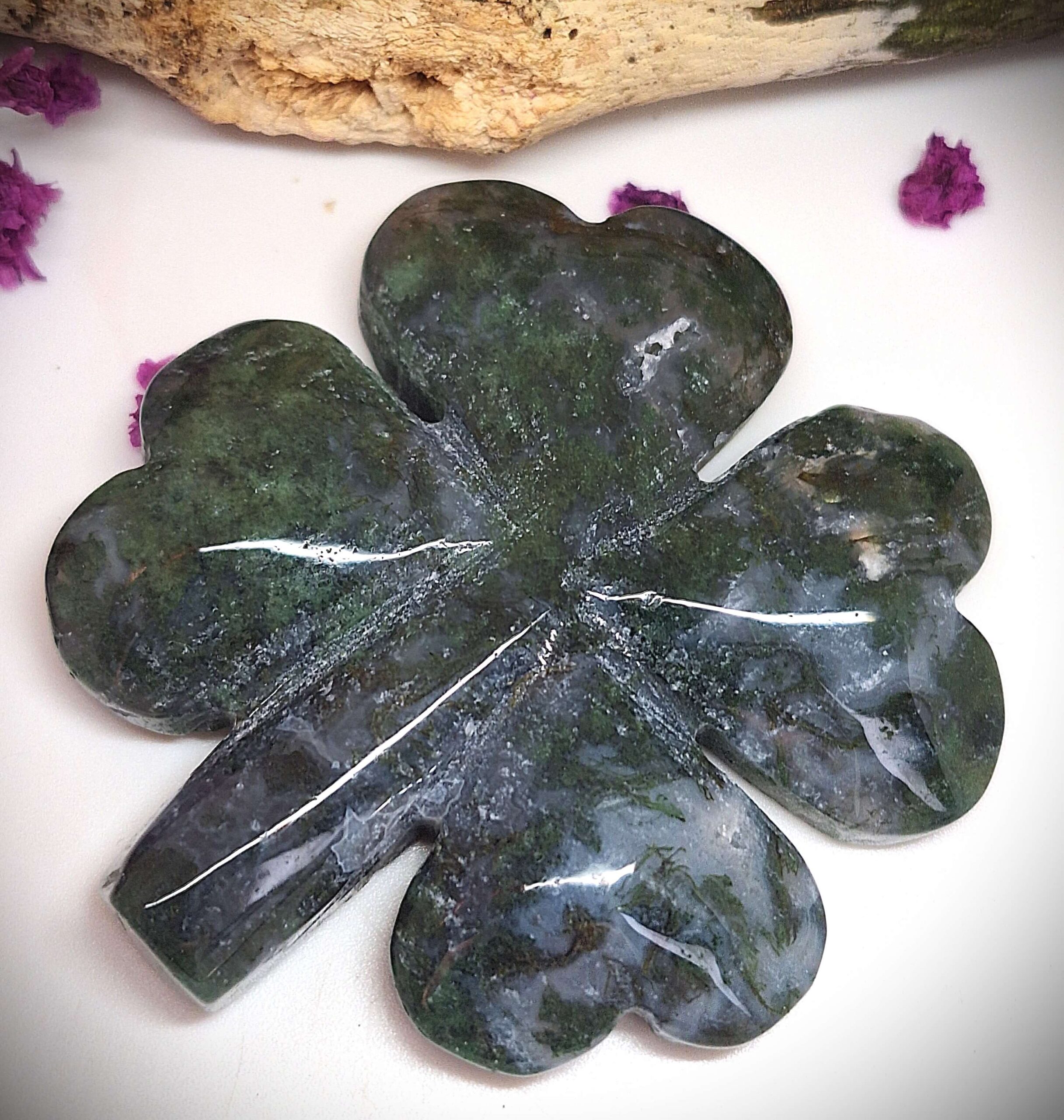 Handgefertigtes Moosachat Kleeblatt-GlückssteinMoosachat Kleeblatt – Glück & Erdung