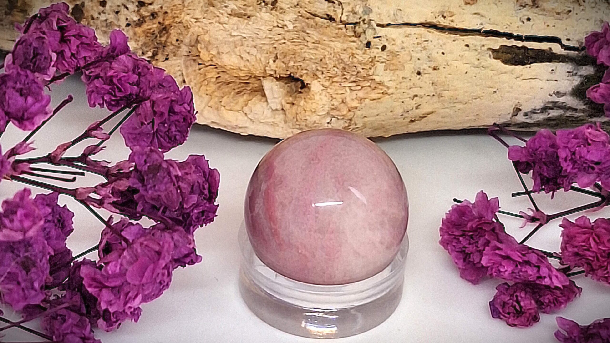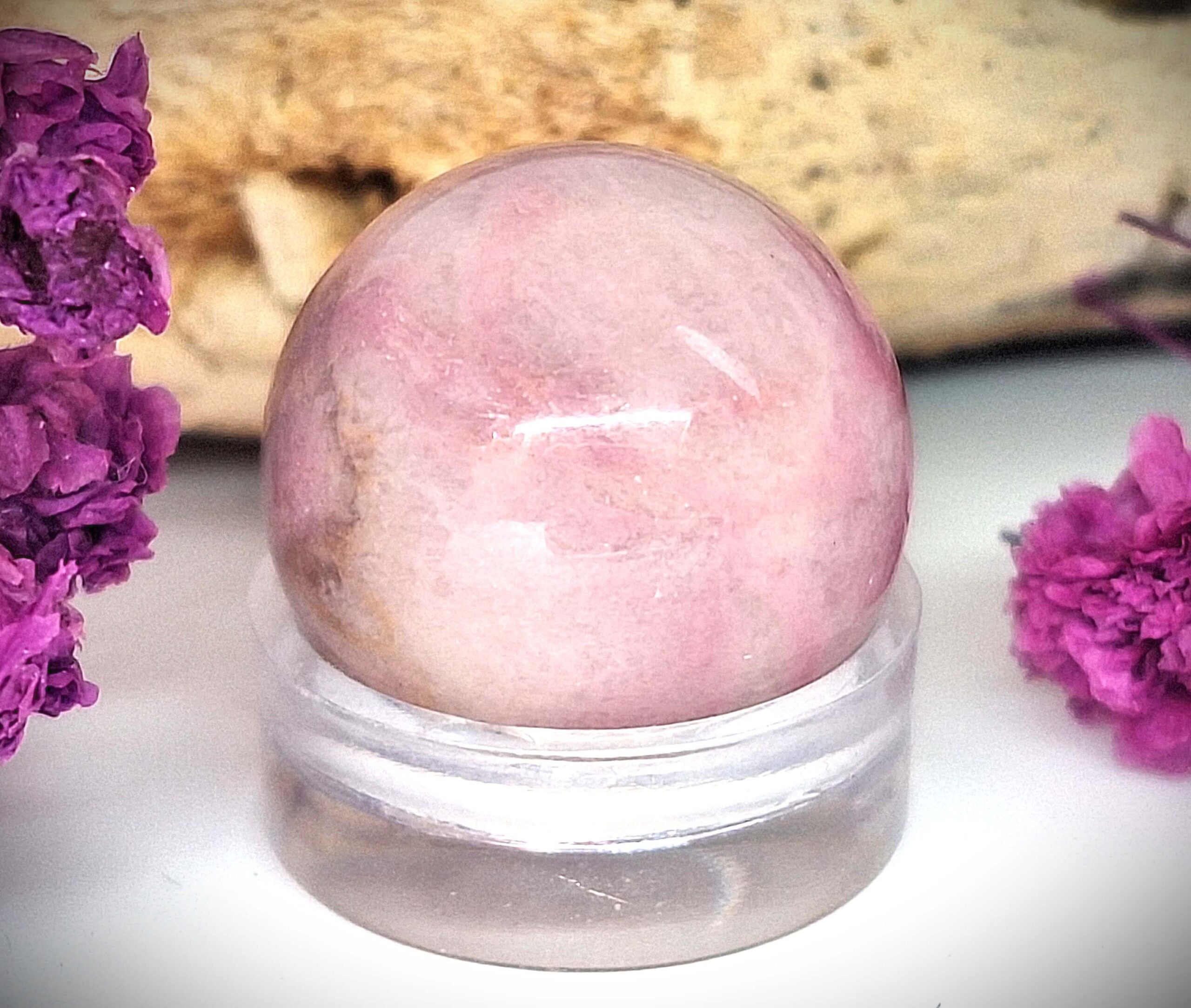 Zarte Rhodonit Kugel in sanften Rosatönen mit natürlichen Farbspiel.