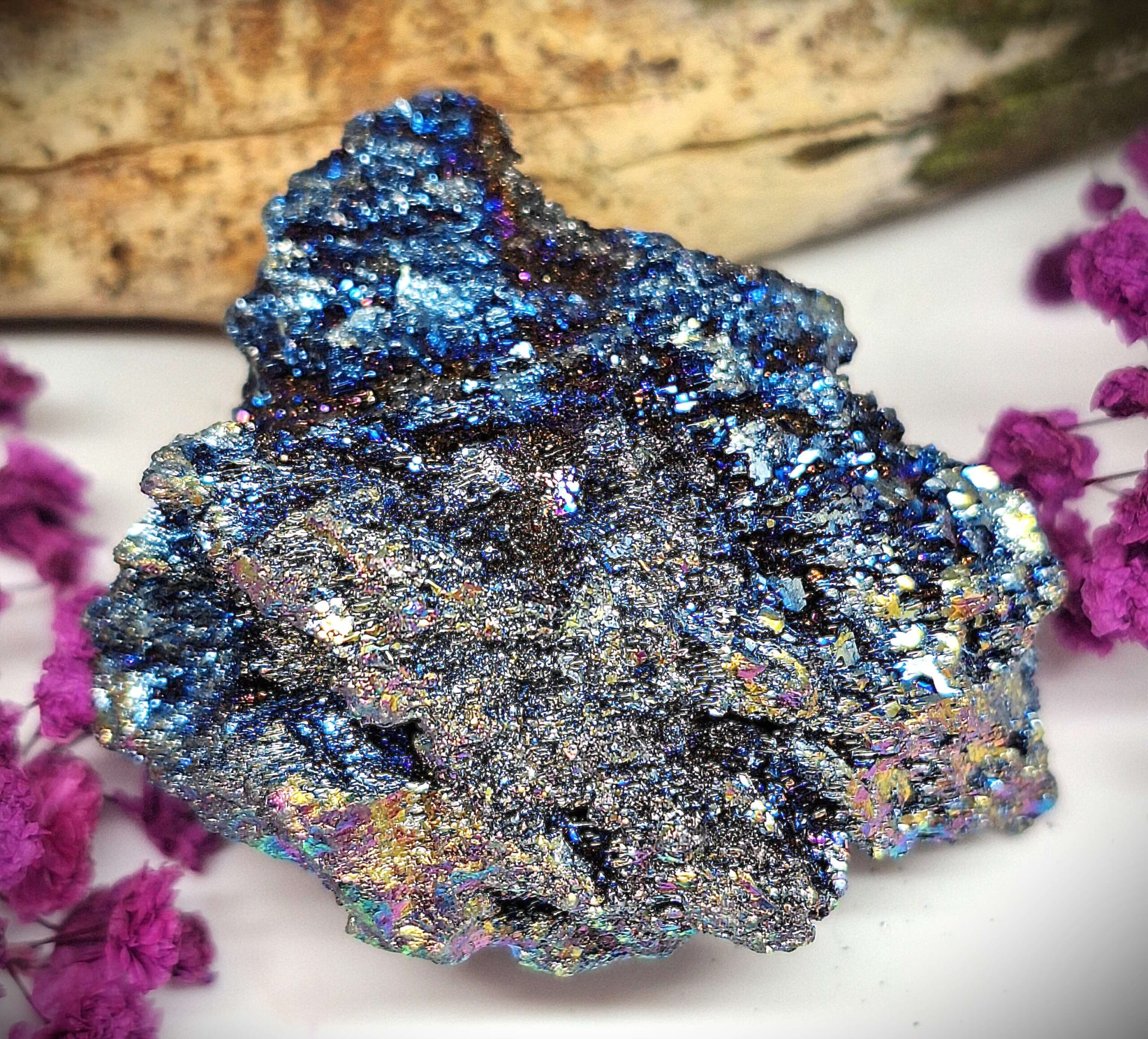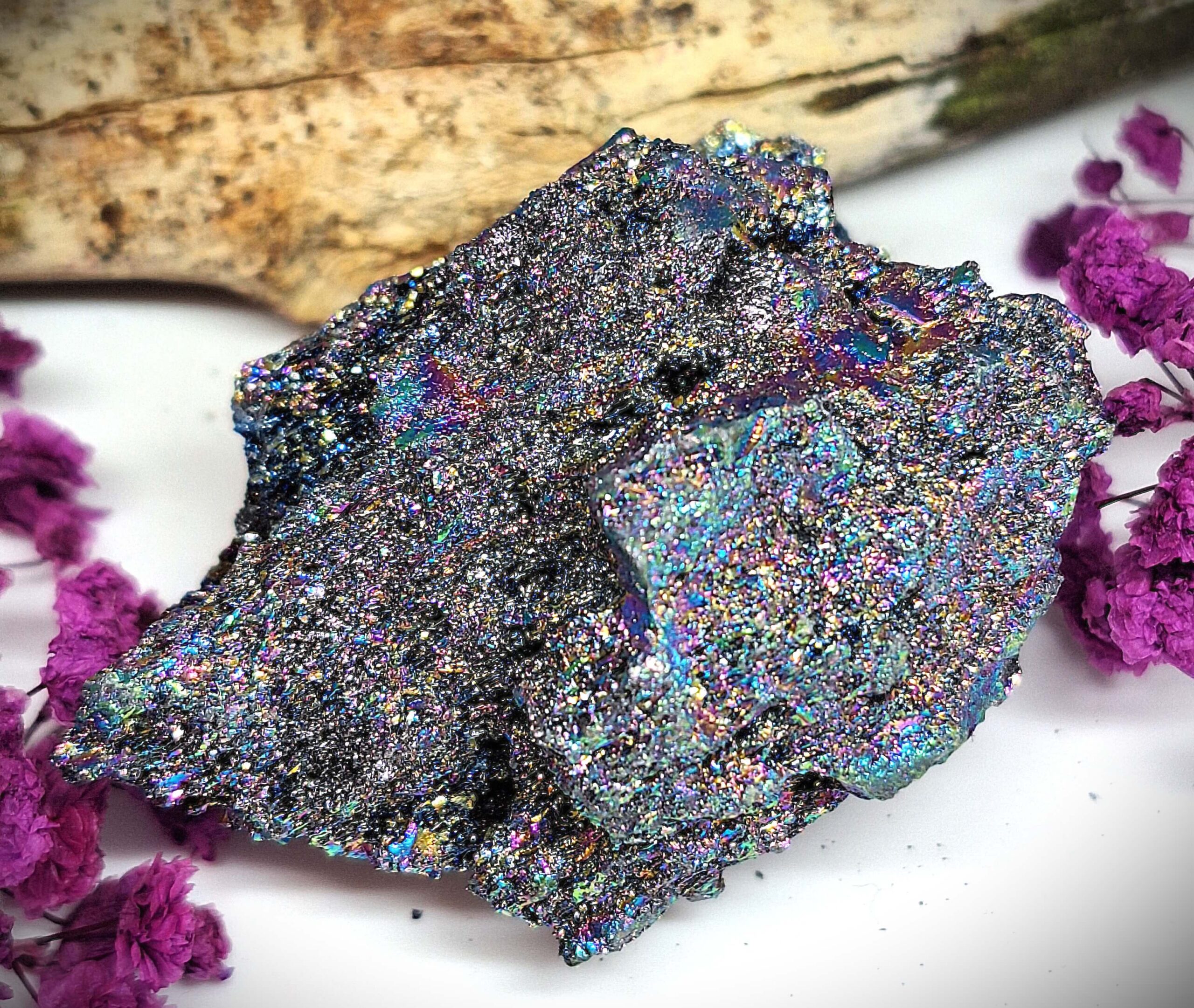 Dieses faszinierende Stück Siliziumcarbid begeistert durch seine intensiv schimmernde Oberfläche mit spektakulären Regenbogenfarben. Je nach Lichteinfall zeigen sich kräftige Blau-, Violett-, Gold- und Metallic-Töne, die dem Kristall ein außergewöhnlich lebendiges Funkeln verleihen.